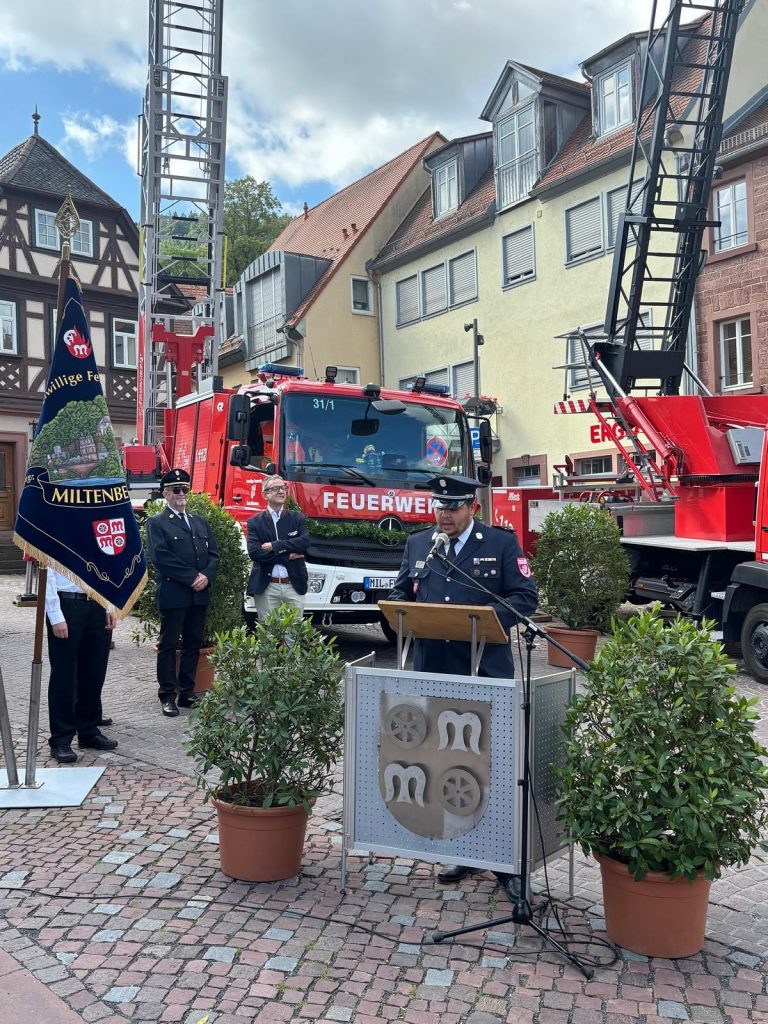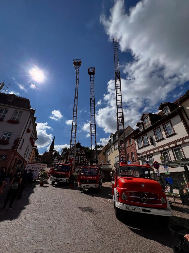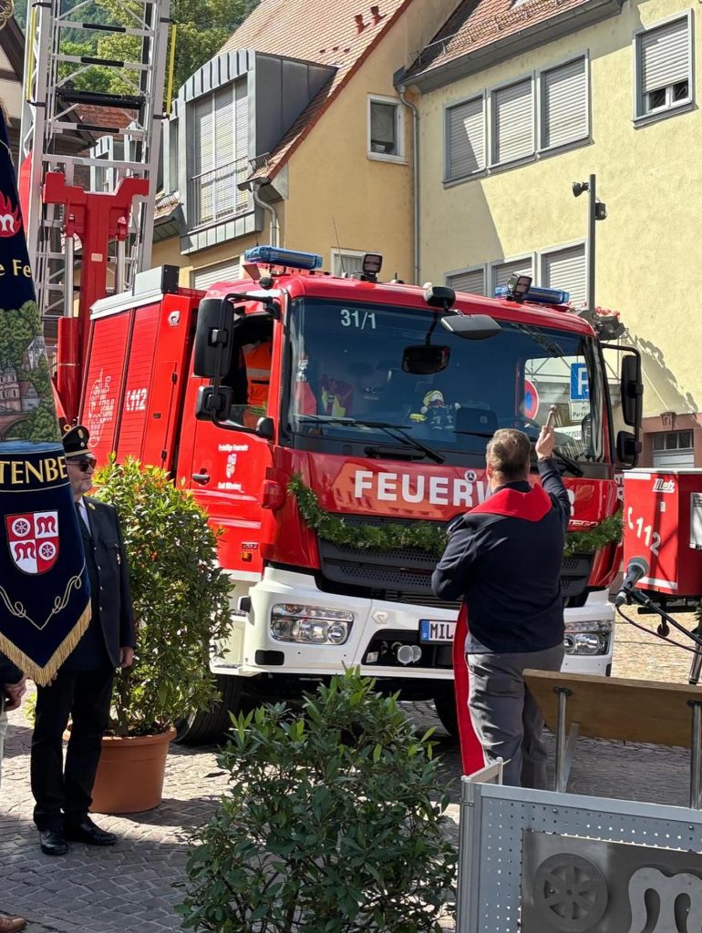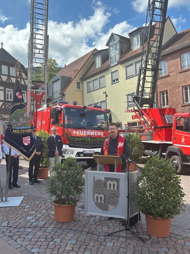Am Samstag, 12.07.2025 wurde die neue Drehleiter L27A-XSC (Compact) DIN 18/12 der Freiwilligen Feuerwehr Miltenberg am Engelplatz offiziell gesegnet.