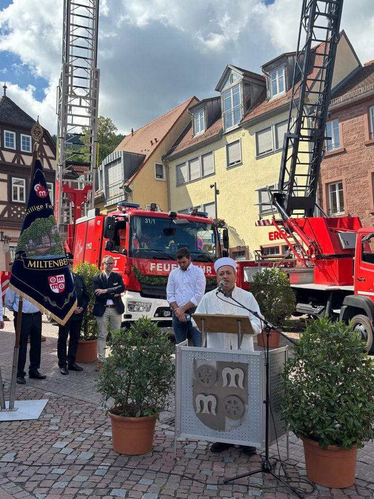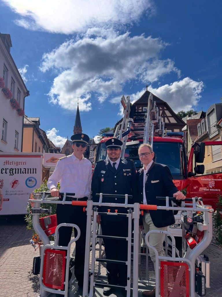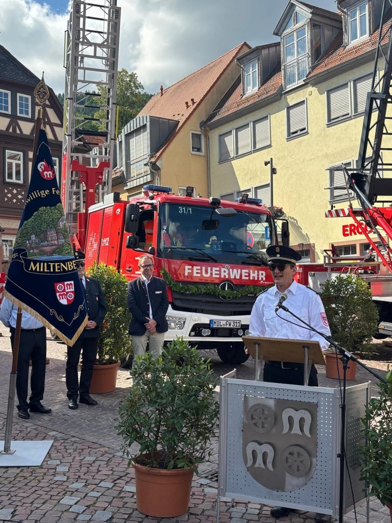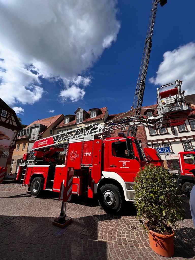 Am Samstag, 12.07.2025 wurde die neue Drehleiter L27A-XSC (Compact) DIN 18/12 der Freiwilligen Feuerwehr Miltenberg am Engelplatz offiziell gesegnet.