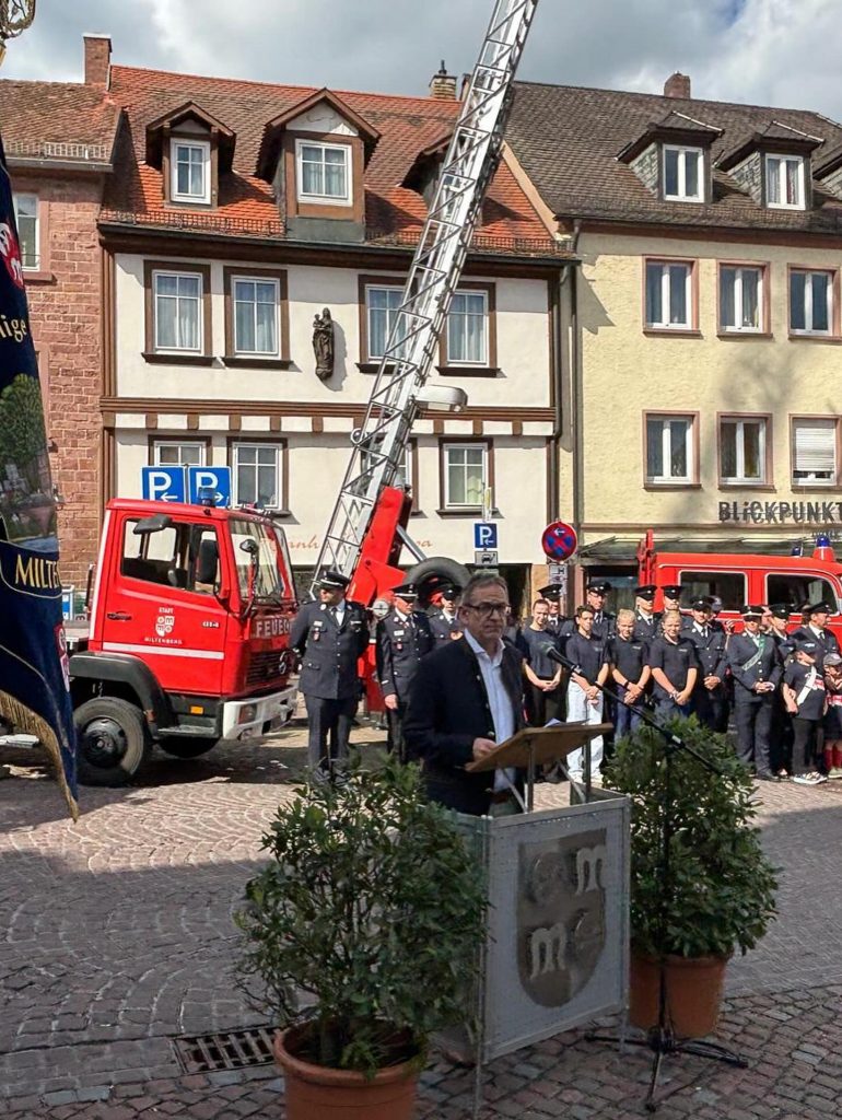 Kreisbrandrat Martin Spilger überbrachte, zusammen mit Ehren-Kreisbrandrat Karlheinz Brunner und dem zuständigen Gebiets-Kreisbrandmeister Matthias Berres, die Grußworte der Kreisbrandinspektion.
