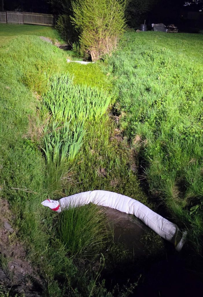 Bald war das verursachende Anwesen ausgemacht. Auf einer Baustelle ergoss sich Heizöl im Keller und floss in den Abfluss und über den Kanal in den Bach. Die Feuerwehren stoppten den Ausfluss und banden im Gebäude das Heizöl mit Vlies und Bindemittel. Im Faulbach liegen nun von Altenbuch bis Breitenbrunn sieben Ölschlängel um Ölreste aufzufangen.